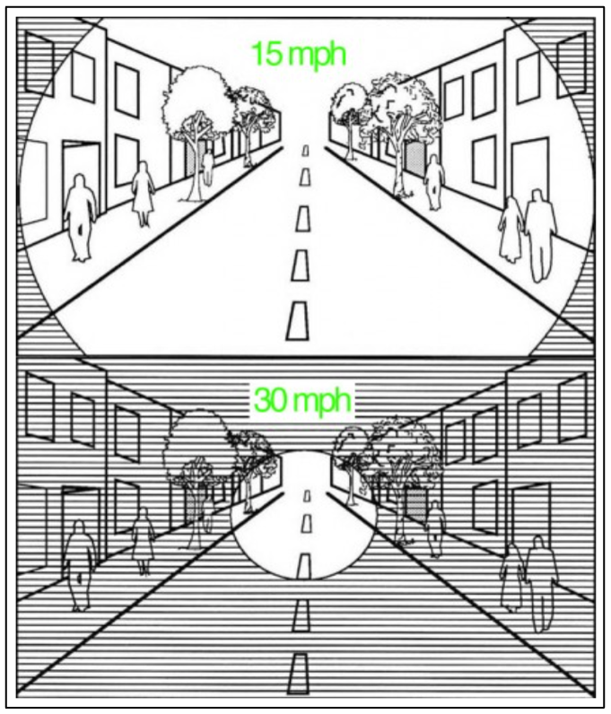 - Driver field of vision narrows as speed increases, meaning pedestrians aren’t even seen until it’s too late.
